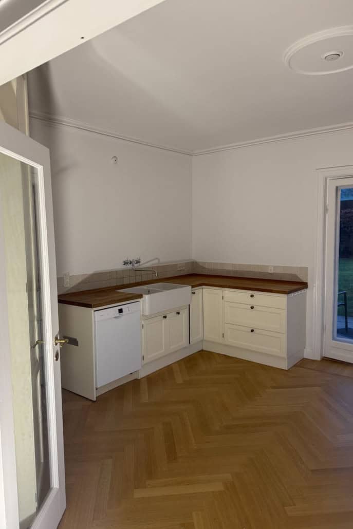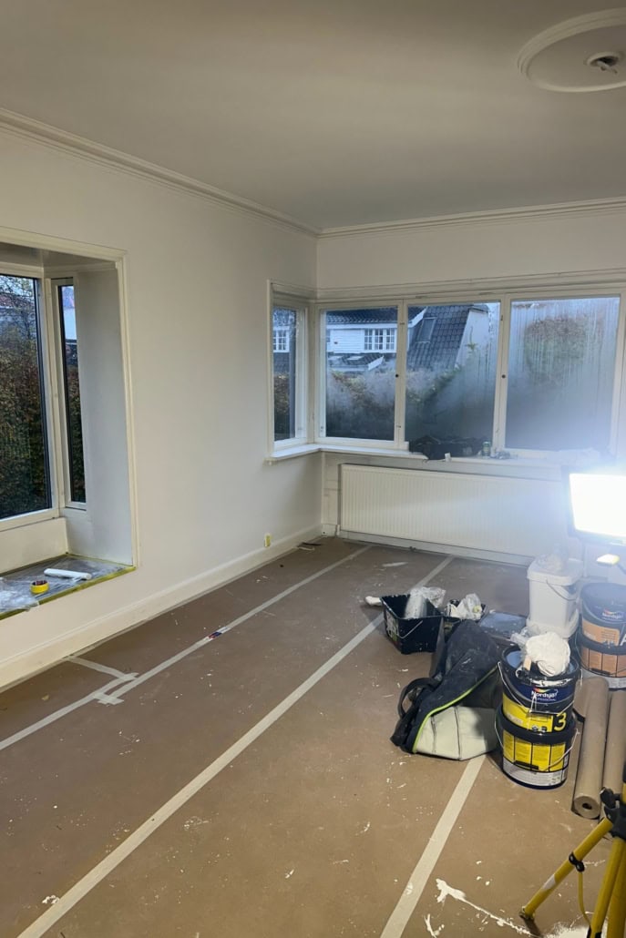 Som følge af det gode resultat har vi nu også fået opgaven med udvendig renovering af facaden og vinduer, som omfatter udskiftning af fuger i murværk, alle stueetagens vinduer samt stern, tagrender og nedløb. Arbejdet planlægges til april, hvor vi samtidig skal udføre bygherres nye tilbygning, så vi fortsætter som totalleverandør på hele projektet.