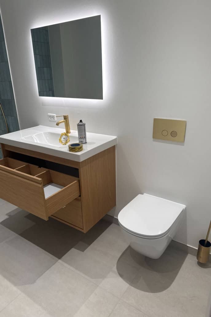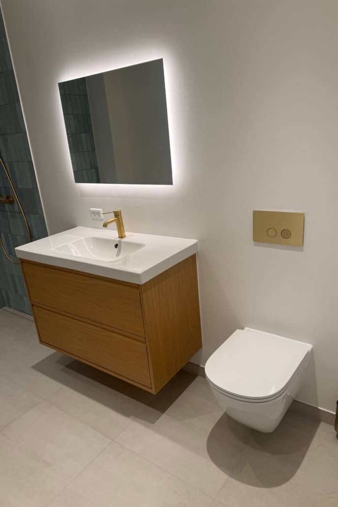 Badeværelset blev opført med nye vand- og afløbsinstallationer, inklusiv faldstamme og kalkanlæg, samt nye overflader, fliser, bruseniche, sanitet og inventar – udført med fokus på funktionalitet, kvalitet og æstetik.
