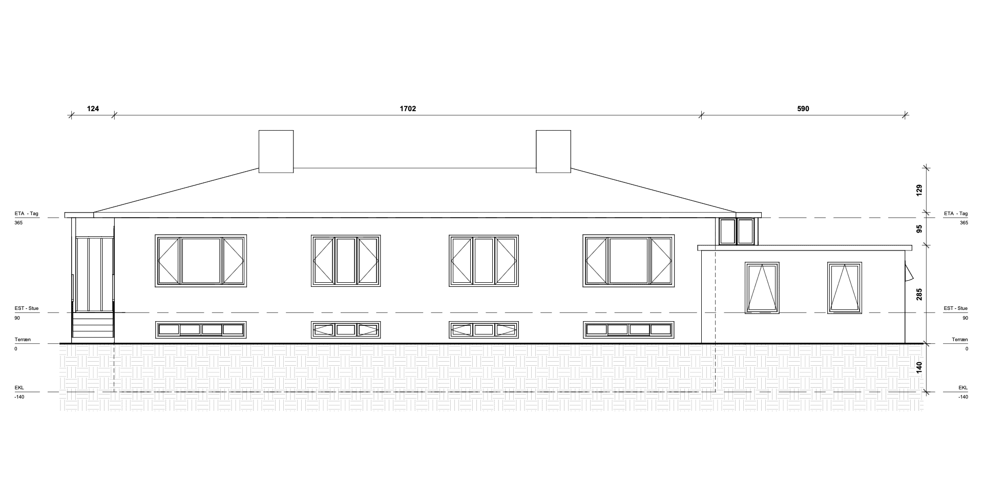 Tilbygningen består af 60 m² trækonstruktion, designet til at matche den eksisterende ejendom. Facadebeklædningen udføres i lodrette trælameller behandlet med sort maling, mens vinduer og døre leveres i sort aluminium. Ved indgangen til den eksisterende ejendom etableres et ovenlysvindue, som tilføjer lys til den tilstødende del af bygningen og skaber en harmonisk forbindelse mellem de to bygninger.